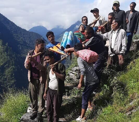 गोल्फा गांव में ग्रामीणों ने घायल महिला को डंडी कंडी पर लादकर पहुंचाया अस्पताल
