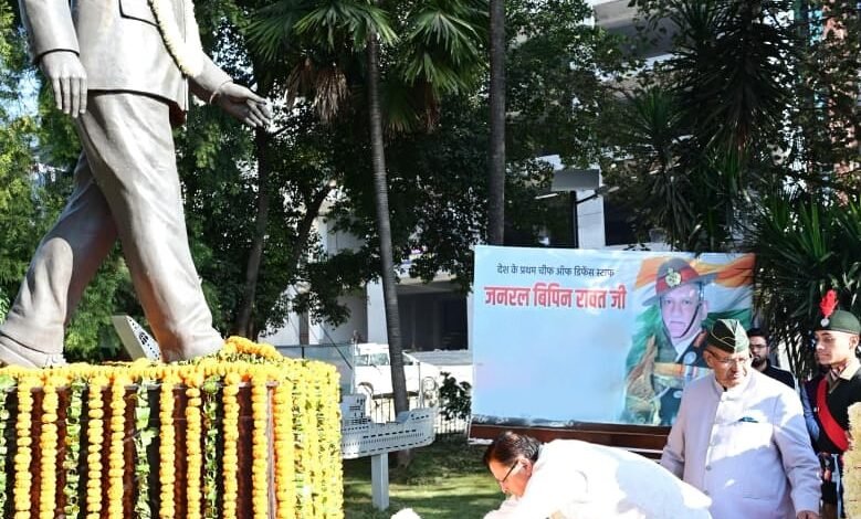 देहरादून। कार्यक्रम के बाद मुख्यमंत्री पुष्कर सिंह धामी ने कनक चौक स्थित पार्क पहुंचकर भारत के प्रथम चीफ ऑफ डिफेंस स्टाफ स्वर्गीय जनरल बिपिन रावत की चतुर्थ पुण्यतिथि पर उनकी प्रतिमा पर पुष्पांजलि अर्पित की। सीएम ने कहा कि “जनरल बिपिन रावत का जीवन देशभक्ति, अनुशासन और कर्तव्यनिष्ठा की सर्वाेत्तम मिसाल है। उनका योगदान सदैव उत्तराखंड और देश को गौरवान्वित करता रहेगा।” मुख्यमंत्री ने जनप्रतिनिधियों, सैनिकों और नागरिकों के साथ दो मिनट का मौन रखकर उनकी आत्मा की शांति के लिए प्रार्थना की और शहीदों के सम्मान में राज्य सरकार की प्रतिबद्धता को दोहराया। मुख्यमंत्री ने जनरल रावत के अदम्य साहस, नेतृत्व क्षमता और राष्ट्र के प्रति उनके सर्वाेच्च समर्पण को स्मरण करते हुए उन्हें उत्तराखंड एवं देश का गौरव बताया।