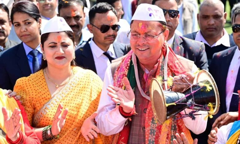 मुख्यमंत्री आवास का प्रांगण सोमवार को होली के रंगों में सराबोर नजर आया। इस दौरान प्रदेश की सांस्कृतिक समृद्धि और एकता के भी दर्शन हुए। पूर्वाह्न से ही प्रदेश भर के लोक कलाकारों, संस्कृति कर्मियों की टोलियां होली गायन करते हुए, सीएम आवास पहुंचती रही। एक तरफ गढ़वाल-कुमाऊं से लेकर जौनसार तक का होली गायन था, नृत्य था। इस दौरान होली के गीत गूंजे। पारंपरिक गायन हुआ। ढोल, मंजीरे बजे। पारंपरिक वाद्य यंत्रों की संगत ने होली गीतों के प्रभाव को और बढ़ा दिया। आओ दगड़ियो, नाचा गावा, आ गई रंगीली होली का आह्वान यदि कुमांउ से आए कलाकारों ने किया, तो राठ क्षेत्र के कलाकारों ने गाया-आई डान्ड्यू बसंत, डाली मा मौल्यार।